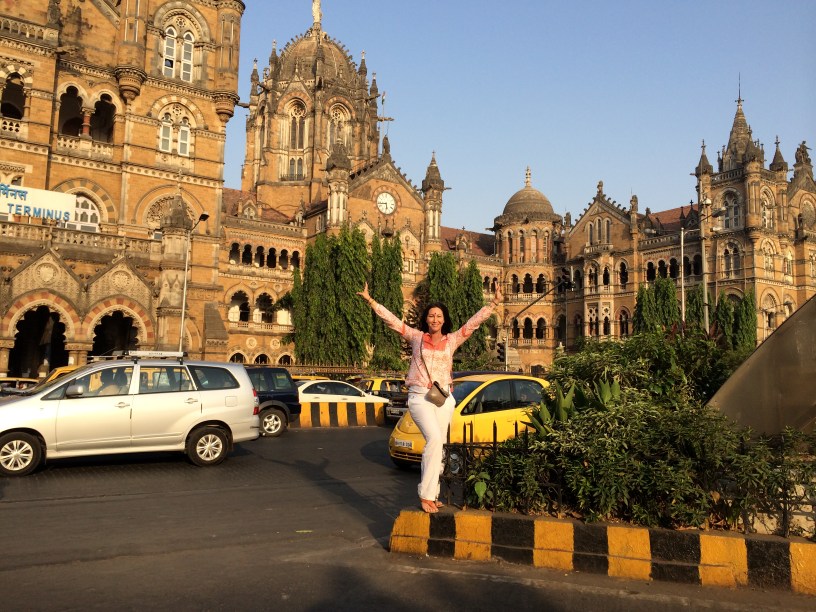 Next we drove by Chhatrapati Shivaji Terminus (formerly Victoria Terminus) to check out this beautiful train station which was constructed in Victorian Revival Gothic style Like everywhere in India, the traffic was so bad, we decided to skip going inside and instead had our driver drop us off while he circles around so we can take silly Pictures. 🙂
