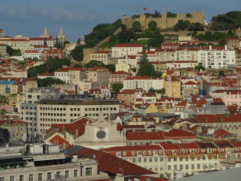 We again made our great trek from our apartment down the steep hill to Rossio to catch bus #37 from Praca da Figueria, and as you can imagine, that pop up fair of tents selling everything, is still there, including the same drunks. Pleasantly, I was offered cocaine and weed from a marvelous gentleman to whom i replied that I was all hooked up already ( of course i didn’t have any drugs) Seriously its such a weird problem in Lisbon with people trying to sell you drugs right on the street . A few minutes of waiting and a few minutes later, we exited the bus #37 at the top of the winding streets of the Alfama at the Sao Gorge Castle gate. Following Rick Steve’s Alfama stroll, we started here as it is at the top and all sights can then be seen and experienced walking down. Awesome Idea. Today is Saturday, and the Alfama is teaming with tourists and people. There are supposedly some huge swap meet somewhere around here ( we never found it) and everyone is out It is a glorious day, the sky is so blue and beautiful and the temperature is a lovely 66 degrees. We decided against going into the Castle as the lines were long and we weren’t that interested in it. Instead we cautiously walked down, avoiding speeding cars and motor bikes and hopping on and around trolley tracks until we came to the Miradouro de Sao Jorge where you can view the ships docking as well as the Tejo River and the April the 25th Bridge. We kept winding ourselves down and down through little squares and tight corners passing by cheering tourists enjoying a morning beer as well as eerie stares from the well-worn women who probably were authors of the haunting Fado music so famous in this area We came across a beautiful couple , no doubt Brazilian, singing some Bossa Nova type music for diners sitting outside. They sounded so beautiful. I have to admit that we didn’t really follow Rick Steve’s advice that very much this time, as were having so much fun exploring on our own. We finally sat for lunch and wine and a good 2 hours later we slowly trekked it back on foot to the Baixa and as usual up those steep steps back home for a little rest. Tonight is Saturday and we plan on going out and enjoying the nightlife so famous in our neighborhood.