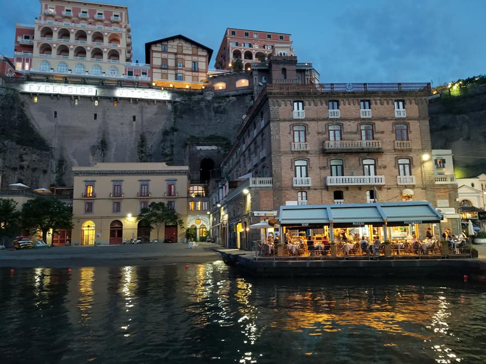 After my cocktail I enjoyed a lovely passeggiata and noticed how the fabulous cafe’s around Piazza Tasso were filled with smiling faces , enjoying the early evening summer air. I walked the very steep steps down to the water where there seems to be a whole other city just waiting to be explored. A small looking fishing village that is no doubt a place inhabited for millennia . I sit at a typical tourist bar, order an apperol spritz and watched the sun go down. It was so beautiful. After I took the elevator that cost a fortune and made my way top side …. The elevator opens up to another gorgeous leafy piazza