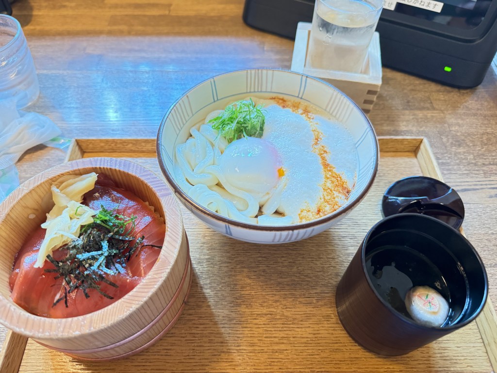 I was hungry and I found a place That served ISE udon with egg and yamaimo. The set also came with sashimi over shiso sushi rice and of course I had to have sake for lunch