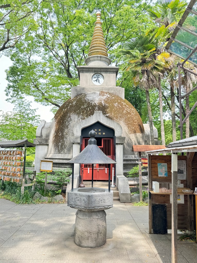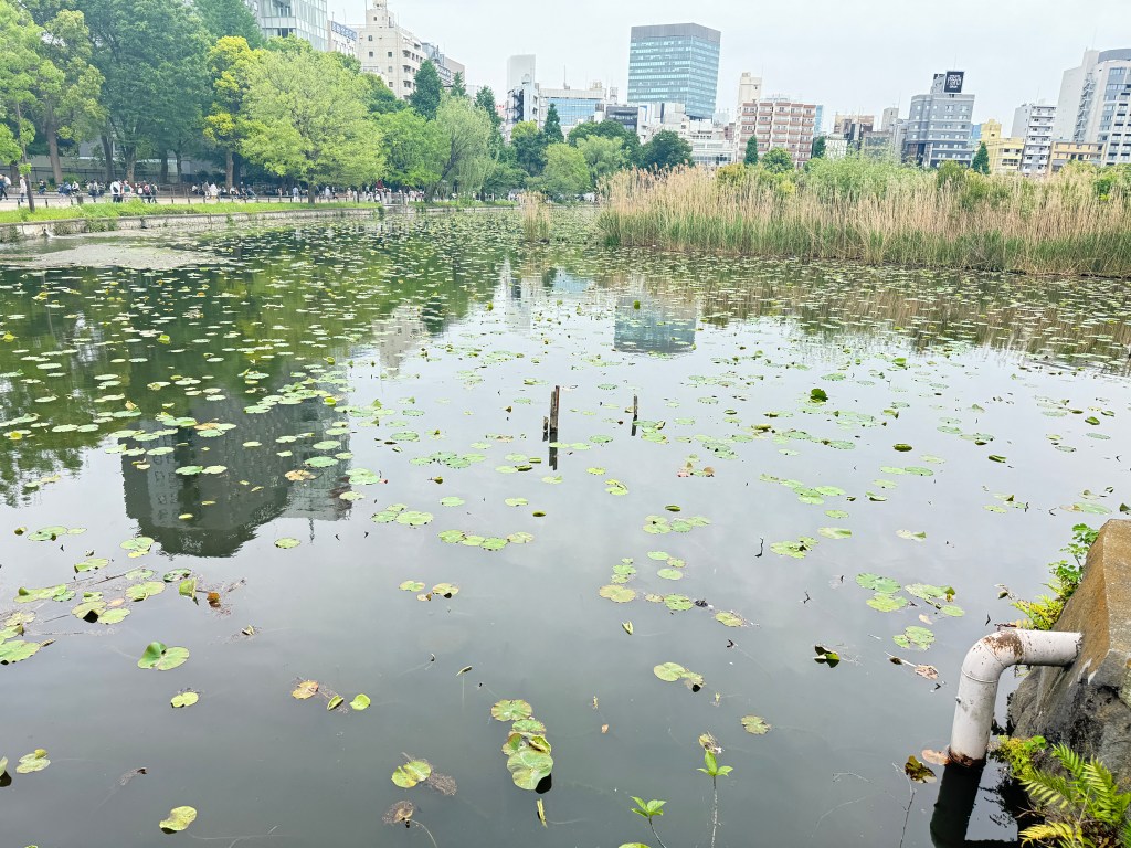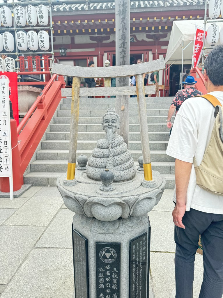 After lunch as a whole family, we walked back to Ueno Park. We visited this temple dedicated to a Buddha. The temple features a man’s head and a snake body out front by the senko area. It’s surrounded by Lotus fields.