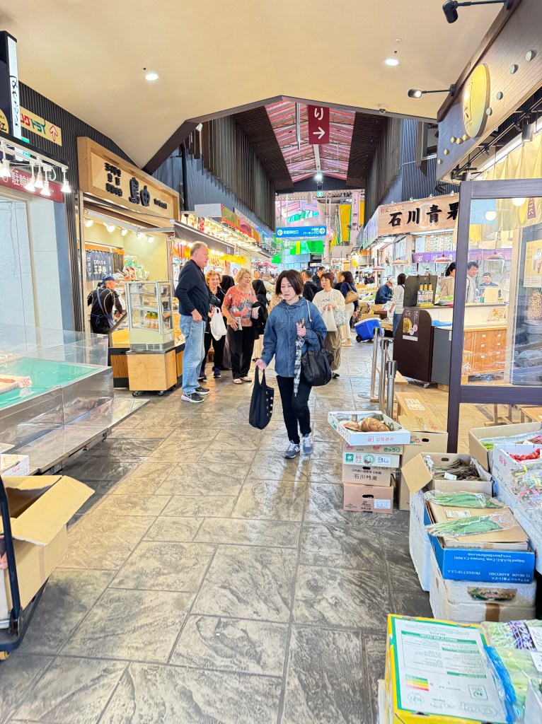 I had a beautiful walk to the castle. Along the way, I stopped at Omicho Market. It has been the largest fresh market since the Edo period. You can find all sorts of delicacies here. But for me, I sometimes have a hard time with fresh markets, even if it’s primarily seafood.